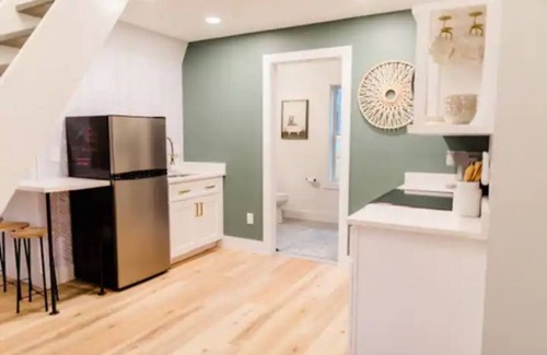 This cabin is a chic space with a fully equipped kitchen, spacious bathroom, living room, and upstairs bedroom loft. The loft contains an open bedroom with a queen size bed and dresser. To access the loft, there is a steep staircase. In addition to the loft bedroom, we offer a queen pull out sofa bed located on the first level of the cabin.