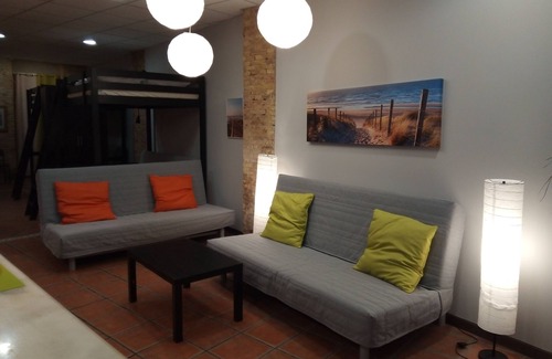 Ground floor loft with access from a beautiful and quiet square. The establishment is located in a protected building from the beginning of the 20th century. It is a large living-dining room-kitchen and beds. It has 2 double beds in height (1.40 x 2.00 m) and 4 sofa beds (1.40 x 2.00 m). Equipped with dining table for 6-8 people; Kitchen-bar with 6 stools, flat screen TV, wifi, washing machine, oven, dishwasher, refrigerator, microwave, coffee maker and toaster. It has 2 full bathrooms (sink, toilet and shower). Installation of ventilation and air conditioning. It has an outdoor space for bicycle parking.