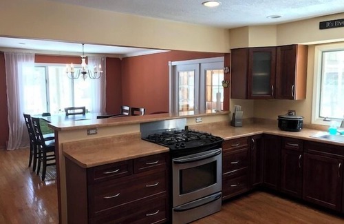This beautiful unit is the former Estrold Resort Manager’s home. It sits centrally located in the middle of the resort with amazing 360 views of the resort grounds with decks on every floor giving you great views of the whole property. This house has 4 bedrooms and 2 full bathrooms located upstairs with the bedrooms and a 1/2 bath on the main level. The bedrooms upstairs are situated as follows: 1King bed with master bathroom, 1 Queen bedroom, 1 Queen & Twin Bunk Beds Bedroom, 3 Twins Bedroom. All bedrooms have a deck over looking the resort grounds, spacious bedrooms, with ceiling fans and large closets. Main level has a very spacious kitchen with all the comforts of home, dishwasher and lots of great counter space, regular coffee pot. Fridge has an ice machine and filtered water dispenser. There is also a washer and dryer located in the cabin for your convenience, which comes in handy when you have this many people on vacation. Living room has nice windows over looking the resort and a brick fireplace to enjoy on a cold night. Living room also has a nice large leather couch with power recliners, very comfortable and helps you enjoy the 60inch flat screen smart tv that you can enjoy Netflix & Hulu on free of charge. (Amazon available if you have a login) Dining room flows into the kitchen with great bar top counter and stools and also a nice large kitchen table, great for game nights or family dinners. Off of the dining room is a nice 3 season porch with couches and windows on 3 walls for a great sitting area to enjoy the views and open the windows for some fresh air. Off of the back of the house is another nice deck on the main floor and an upstairs deck the connects to 2 of the bedrooms. Just off of the side of that is a nice outside fire pit for you to enjoy. RESERVE THIS COZY COTTAGE AT STEPAWAY VACATION RENTALS!