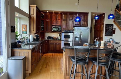Spacious gathering inside and out. Private from neighbors. Hot tub seats eight and views day or night. Modern amenities throughout with gas fireplace equipped great room. Individual get away spaces without feeling confined. Many many attractions in less than an hours time. Safely experience natures bounty. Cooks delight for large family or holiday meals/baking in a well stocked kitchen with abundant cooking amenities: like double ovens, wok, air fryer, crockpot, rice cooker, skillets (electric and for gas stove), roasting pans, plate warmer, microwave, 4 slice toaster, large Keurig and six burner gas cooktop, Traeger and barbecue for outside dining or easy family gathering with food delivery or take-out just minutes away. There are indoor and outdoor games.