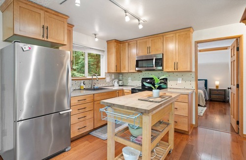 Kick back and relax in this calm, stylish basecamp in the woods—perfect after a day of hiking, mountain biking, or skiing nearby. Nestled in the quiet community of Sudden Valley, you'll enjoy direct access to nature preserve trails just steps away, along with community amenities like a golf course, marina, playgrounds, and seasonal pools. Inside, the home is filled with natural light from skylights and forest-facing windows. Enjoy cozy evenings by the wood-burning fireplace, cook with ease in the full kitchen, and sleep soundly in comfortable beds with quality linens. The setting offers exceptional privacy—you might only see one car all day. Whether you're headed to Mt. Baker, exploring Bellingham, or crossing the border for a ski day at Cypress Mountain, this is the perfect home base for adventure and relaxation.