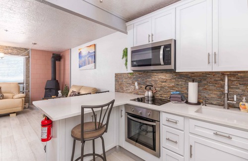 Upon entering the condo, you will be greeted by the warmth of the electric fireplace in the living room which features two plush leather love seats that invite you to sink in and relax. There is a large TV, and the high-speed internet is perfect for snuggling up and watching a movie or streaming your favorite show.