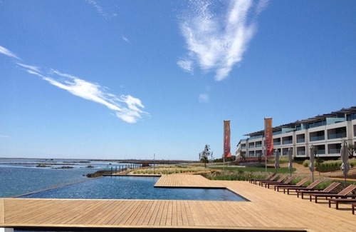 The living area has direct access to the 10 m² south facing balcony, equipped with table, chairs and sun loungers and with spectacular views of the lush garden, infinity pools, Ria Formosa lagoon, the Atlantic Ocean and the island of Armona A perfect place to hang out with a cocktail or an al fresco meal on Algarve nights!