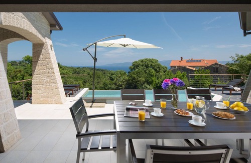 This unique luxurious villa built in 2013 accommodates 8 guests in four rooms and incudes large living room, dinning room, five bathrooms, tavern with a fireplace and a terrace with gas barbeque. Two acres of private surrounding land provides ample privacy for the guests and a wonderful view over the Kvarner Bay and the islands of Cres and Losinj from any level. The villa features high quality appliances and furniture, HiFi, smart TV's, heated pool with air massage, jacuzzi bath, finnish sauna and a massage chair. The house is fully heated and air conditioned, has solar heating and excellent insulation. Although the house is one unit, it can be used by two families as there are two kitchens. Villa has 36 m2 overflow salted pool and the beautiful "Jadrina" beach is only 600 mtr away and accessible directly from the villa with a 10 minute relax walk through the pine forest path.
