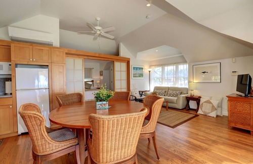 Honu’ea is a one bedroom, one bath Hawaiian style cottage. The cottage is located on the second story with its own private entrance. This cottage has a great open floor plan that allows for ocean views from almost every room. The master bedroom includes a king size bed, ample walk in closet for clothes and luggage, and a great view of the landscaped yard and ocean. The living space has an inviting sitting area with a relaxing sofa and chair and flat screen tv/dvd. The kitchen is fully stocked and ready for all your cooking needs. The cottage also has an amazing beachfront lanai with outdoor seating and BBQ. For the really hot Maui summer days the cottage has a central air conditioning unit.