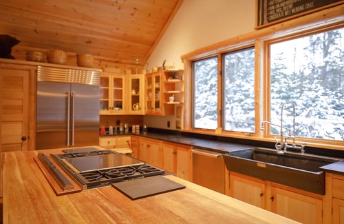 Built in 2007 our luxurious lakeside camp consists of a magnificent hand made adirondack style cedar shingle home and two cozy cabins. Privacy for all. You will enter the main house onto an 1,200sq/ft screened in porch with an outdoor stone fire place, pingpong, handcrafted pine harvest table that seats fourteen. French doors afford access into every room and can be left open to feel the Maine breezes. The great room in the center of the house boasts a magnificent indoor stone fireplace, multiple couches and handcrafted game table. For the chef in you the large chef’s kitchen fully appointed with huge 60" Wolf griddle top to make loads of pancakes, a double oven for baking and it is brand new 2017! , We have just added a new 42" new Sub Zero refrigerator for all your beautiful Maine produce! An original Monson slate farm troth sink will bring smiles as you and your family or friends create meals overlooking the lake and listening to the loons. Behind the kitchen is our Herb Garden and a grassy lawn for the children to run around on. Each bedroom has its own private bath each decorated in a different style. Each bedroom and cabin has a private screened porch with lake views. The furniture throughout the house was handmade by local carpenters and artisans.