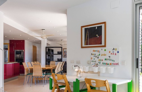 This exclusive villa is located in Tossa de Mar and offers a magnificent view of the nearby sea. The two-storey villa features a living room, a well-equipped kitchen with a large induction hob, dishwasher, large fridge with freezer compartment as well as a separate drinks fridge, five bedrooms, four bathrooms and a guest WC, and accommodates up to ten people. Amenities include reliable Wi-Fi in all rooms, ceiling fans, washing machine, dryer, satellite TV, DVD player, as well as children's books and toys. Baby cots and high chairs are available free of charge. There is a table tennis table on the roof terrace.