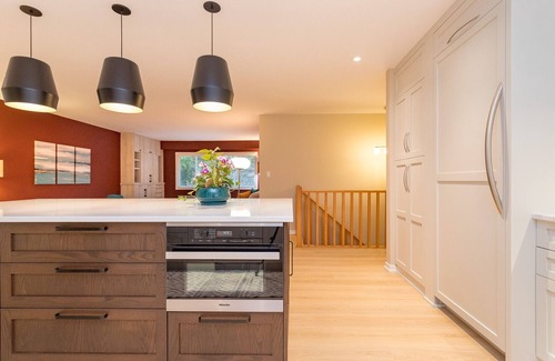 Min 90 days. Max 3 people. This is an outstanding rental as we over- upgraded/renovated in 2019 without plans to move out. We offer preferential rate when occupied by a mature couple (this is the rate posted). Further rate reduction for longer term lease . If a couple couple is occupying the place they are welcome to have occasional guests stay for periods of time (up to 2 weeks /2 guests at a time). This unit is not suitable for families - stairs are unprotected and tall- a visiting infant is fine. This top floor of a house is perfect to work from home with a large den plus a spare bedroom that can also serve as a second den. Amazing kitchen with high end, designer appliances - Fisher & Paykel and Miele, enormous Island and absolutely everything you need to cook regular meals. Several small appliances (Ninja blender, Cusinart food processor, Mixer, Rice Cooker, Slow cooker, Toaster Oven). Beautiful views of Mt Douglas from the huge deck and the den. Quiet mature and house trained dogs are welcome if accompanied by ultra responsible parents. We cannot accommodate cats or puppies in training - without exception. Fully furnished and equipped. Fiberoptic wifi. Smart TV.