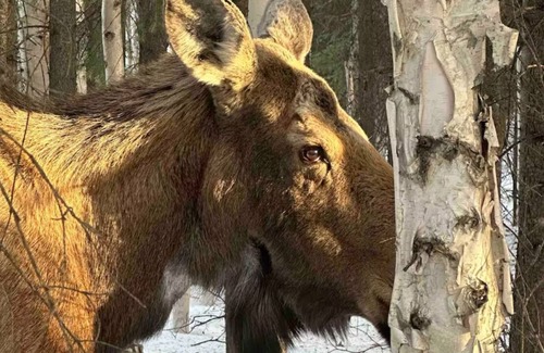 Winter months bring many moose sightings! We enjoy watching them cross the lake often and at times they come right up close to munch on willow branches between the cabin and main house. Sometimes they even stay the night...and bed down nearby.