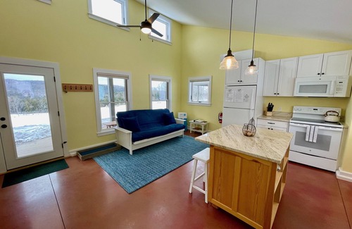 The Sunset Cabin has a private bedroom with a queen bed, a private bathroom with a tub/ shower combo and a living area with a futon couch that pulls out into a full mattress, a small coffee table, and a kitchen island with two stools which serves as the dining table. Clean linens are provided.