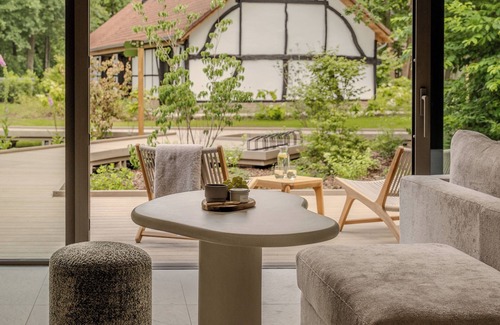 The Suite is ideal for a romantic weekend escape or a cozy stay for two. The lodge features a tastefully decorated bedroom with a kingsize bed, always prepared for you. The modern bathroom comes with a double sink, a spacious shower, and all necessary towels. The open-plan kitchen is equipped with amenities such as a Nespresso coffee machine, a combination microwave, and a dishwasher, making it easy to prepare a delicious meal. The living room leads out to a sunny terrace with garden furniture, perfect for enjoying the afternoon sun.