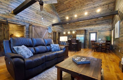 As you enter, you'll see the cabin is spacious, yet cozy with high-end furnishings. The great room has leather furniture a gas fireplace, and TV. The adjoining kitchen features a 3-stool bar area and 4-person dining table.The fully-equipped kitchen features granite counters, stainless steel appliances, while the Great Room features a rock fireplace, richly stained Pine interior, and windows that bring in the scenic outdoors.