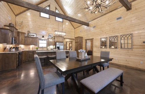 Step into The Big Chill, where an inviting open floor plan ushers you into the epitome of entertainment and comfort. As you enter, the living room greets you with a blend of upscale, modern, and rustic décor, centered around a floor-to-ceiling fireplace and TV, crafting the cabin's warm heart with ultra-plush seating. The flow from the living room to the dining area is seamless, featuring a traditional wood table with bench seating for 8, perfect for shared meals and moments. Through the dining room, the kitchen boasts a spacious granite island with counter seating, complemented by stainless steel appliances and all the essentials for any stay duration.