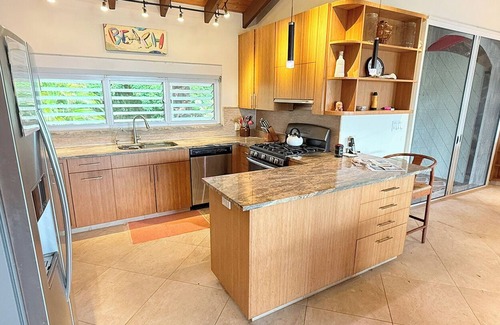 Kitchen: The heart of the home—the kitchen—boasts exquisite bamboo cabinetry handcrafted by a local artisan, complemented by lustrous granite countertops and state-of-the-art stainless steel appliances. Enjoy cooking with a French door refrigerator, gas stove, dishwasher, microwave, and drip coffee maker, alongside a complete set of cooking and dining essentials tailored for culinary enthusiasts.