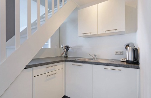 Enter it via an metal staircase leading to the rooftop terrace, where the entrance to the apartment is also located. The spacious living room features an open kitchen with modern amenities such as an electric stove, oven, toaster, refrigerator with freezer, Senseo coffee machine, kettle, and dishwasher. In the cozy seating area, there's a comfortable sofa. At the dining table with five chairs, you can enjoy your meals in all comfort, and there's even a separate toilet for added convenience.