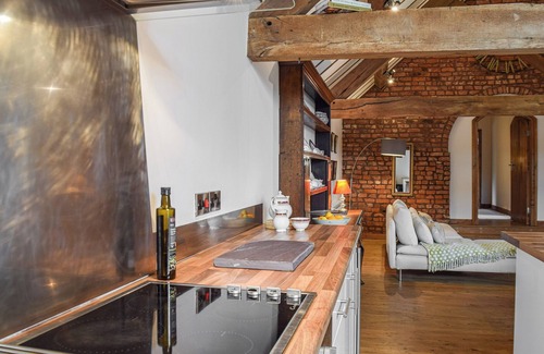 Shower Room: Cubicle Shower, Toilet. Oil central heating, electricity, bed linen, towels and Wi-Fi included. Travel cot, highchair and stairgate. Front sitting-out area with garden furniture. Bike store. Private parking for 3 cars. No smoking.. This charming holiday apartment can be found nestled within the picturesque surroundings of a working dairy farm, just under 2 miles from the Cheshire market town of Nantwich. Situated on the first floor, you’ll find the apartment is full of wonderful features, including beautiful, heavily beamed vaulted ceilings, an exposed brick wall and feature windows. The master bedroom boasts a super kingsize bed plus the benefit of an en-suite. The second bedroom has two platform style beds, and there’s a separate shower room. The inviting living space is spacious and open plan, making it sociable by design and perfect for catching up with loved ones. Externally there’s a seating area to the front with far reaching countryside views complete with cattle.