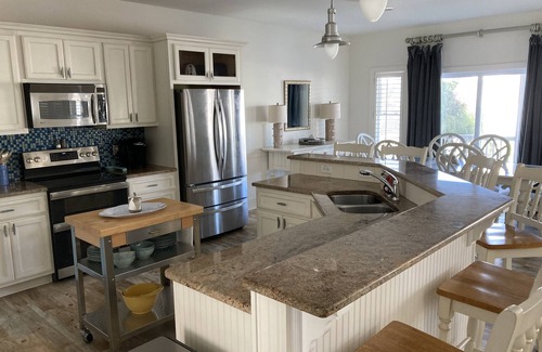 Emily's Perfect Day Beach House at 23 Cumberland St. provides a great setting to have a perfect day, every day. The back of Emily's Perfect Day is directly fronted on a canal waterway. These canals are manmade. Some of the older canals have natural edges, and the newer ones have nicer concrete sides to them. 23 Cumberland is on one of the concrete canals, with deep water, and can handle boat travel, even at low tide. This canal waterway is tied into the Intracoastal Waterway a short distance away. At Ocean Isle Beach, there is a “beach access” street every several blocks. The town of Ocean Isle was very thoughtful in setting up lots of beach accesses with parking, unlike most, if not all of the other nearby beaches. Cumberland Street is one street over from beach access Goldsboro St. in a quiet part of the island that does not get many “daytrippers” and 1.2 miles from the island center. The 23 Cumberland is about 400 yards from the beach, but the included golf cart is a delight. You can park it right at the beach access. This is a spectacular home that is very nicely appointed throughout and will provide a very pleasant setting for you and your family to create a memorable vacation. The home features and large great room with hardwood floors on the main level and large bar seating (6 chairs) in the kitchen and dining table for 6- 12 in total. The kitchen is fully equipped with upscale stainless appliances and electric stove. Plenty of pots pans and cooking accessories including crock pot and blender. Two bedrooms on the main level, one with king bed and one with queen bed, both en suite and both with covered decks just outside (street side). Bathrooms are both sink and tub/shower combo. There is an extra 1/2 bath in laundry room area just off the kitchen. Upper level features 3 more bedrooms including a master with king and deluxe bathroom with walk-in shower and garden tub. The master suite also has a private covered porch overlooking the canal waterway. The other two 2 upper level bedrooms are also en suite with shower/tub combos, one with a queen bed and the other with 2 bunk sets. All bedrooms include HDTV’s (7 HDTV’s in total, including one in the outdoor lounge area underneath the house). All bedrooms are large. There is plenty of room to spread out for multiple family groups. All 7 TV’s are smart TV’s with ROKU, and include local channels via FOCUS. The included golf cart seats 4 with the rear seat that can be used as a seat or folded down to take your beach stuff easily to the beach access. Unfinished room on the ground floor with ping pong table. Also in the large garage are beach chairs and toys, corn hole, and bikes. Two single sit-on-top kayaks included. The ground level is an inside air conditioned foyer area and the elevator. Elevator goes to all levels- Elevator door opening 28" wide with inside dimensions of 30"W x 44"Deep x 78" Height. The 23 Cumberland has a nice fenced yard on the waterside and a large private dock and fish cleaning stand. Dock has water hose at the dock, which is very handy for our boater guests. Outside underneath house is a nice gas grill and bar area with seating. Covered underneath is a great gathering area for family conversation, hanging out, and games – includes a hammock. The hot tub (6 person) is great and is situated in very nicely laid out back yard with great space for gathering and hanging out. These extras all provide a nice touch for families and make Emily's Perfect Day Beach House a great value and a great family choice.