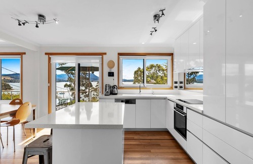 Outside the expansive two level deck beckons with a gas BBQ, market umbrella and outdoor furniture, perfect for alfresco dining and relaxing against the backdrop of uninterrupted views across North West Bay to kunanyi/Mt Wellington, and across to Dennes Point on North Bruny Island.
