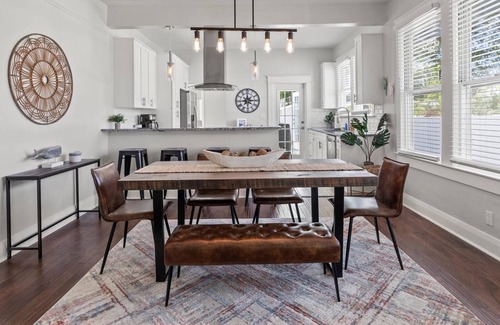 This Industrial Modern design themed home is located in an area of gentrification in Tampa and is complete with renovated kitchen, bathrooms, covered front porch with swing, private pool with heater(pool can be heated for an additional fee) & spa (spa can only be heated / no charge until 10:00pm), outdoor dining, & a fenced backyard that offers complete privacy for your enjoyment.