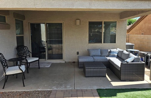 Located in Tucson, 1850 sq ft, Built in 2013 home. This oasis boasts a great relaxation getaway while being close to shopping and food just to mention a few. This home has a big common area and a ready to go backyard getaway. The home has 3 bedrooms - 1 king bed and 2 queen beds. The outside area is set to relax and sunbathe if that's your thing. Enjoy the 4' deep heated pool with an umbrella & steps. The turf is clean on soft of your barefeet. With 2 bathrooms equipped with many amenities, This home also offers an additional office space with a huge bean bag. We think the kids will love this! Whether you're looking to relax or explore the area, this quaint retreat is the perfect home base for your getaway. Within minutes to restaurants, shopping and so much more.... We'll be available to answer any questions while you stay at our place.