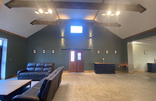 Feel refreshed when you stay at this extremely spacious rustic gem in the picturesque landscapes of Co Limerick. This converted barn is a unique design, built in the early 1950s it was originally able to house 60 cattle! The ground floor which has underfloor heating throughout, boasts a large open plan fully equipped kitchen dinning area with great views of the rolling countryside, a large chill out area and 65" TV. The ground floor also has 4 double bedrooms with king sized beds and ensuite bathroom which contain wet room showers. Upstairs has 3 bedrooms again with 4 king sized beds and shared bathroom with bath and shower. Upstairs also has a cool chill out reading / boardgames area. The ground floor also has two toilets off the kitchen.