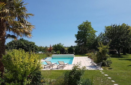 Gite in Saint-Thomas de Conac, near Jonzac, Poitou Charente, Charentes Maritime, close to A10 and fabulous beaches and towns such as Bordeaux, Cognac, and La Rochelle. Le Petit Chez Vieuille is part of our beautiful Maison de Maître which is over 200 years old. It has been beautifully refurbished in the style and feel of French living. Only ten minutes from the A10 Motorway and other major routes but also close to idyllic country roads. Within easy reach of the famous stunning beaches of Royan and St George de Didonne as well as the famous Côte de Sauvage and Côte de Beauté. The wonderful and interesting towns of Cognac, Saintes, La Rochelle and St Emillion are all close-by. You can find excellent restaurants in the region. This is also a major wine region and a 20 minute ferry ride from Royan takes you down the west side of the Gironde through the Medoc, where you will find many world-famous producers of wines. Enjoy the wonderful accommodation or relax by the pool. Walk through the sunflower fields, visit the beaches or wander round the charming and beautiful streets of many historic towns taking in the ambience of long lunches and dinners in many fine restaurants. This is a single Gite, with pool shared with owners. Non-smokers only. The gite should be left in the same clean condition at the end of the stay as found on arrival. If not, a cleaning fee of €75 will be deducted from the security deposit. All linen as well as pool towels are included.