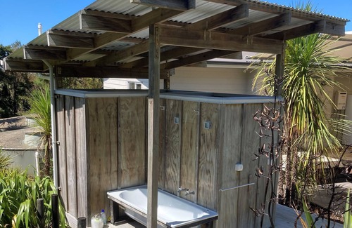 Your hosts Claire and Mark invite you to come and relax in our comfortable self-catering accommodation, in its own private bush setting with sea views. Relax in all weathers in our under-cover outdoor living area. Indulge yourself with a candle-lit soak in our outdoor bath; there are also two bathrooms inside.