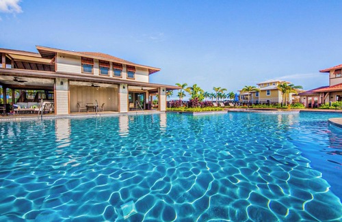Surrounded by a championship golf course, the property enjoys a prime spot on Kauai’s sunny south shore in Poipu. As one of the island’s newer resort communities, it features a selection of upscale two-, three-, and four-bedroom condos.