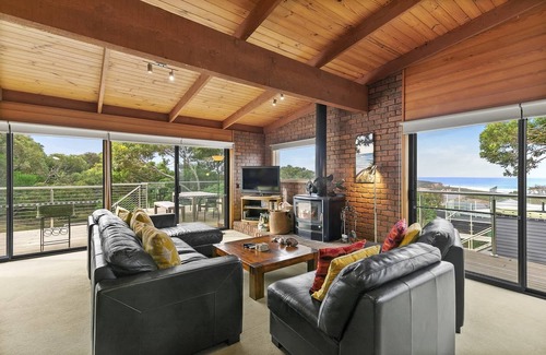 Breathtaking views of the ocean, lighthouse and river mouth from this hilltop location. This substantial four-bedroom residence has two generous living areas and is just ideal for a family holiday. As the property is not far from the National Park you will enjoy abundant birdlife, kangaroos and wallabies feeding in the back yard.