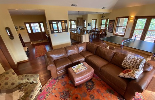 Newly built custom home on gated, private acreage close to dozens of great wineries surrounded by picturesque vineyards. Short drive to Placerville and Apple Hill. 1 hour drive to Kirkwood for world class skiing or to South Lake Tahoe. Huge, well stocked entertainment kitchen, grand fireplace, pool & ping-pong table, wrap-around deck for incredible sunset views. Screened in porch for outdoor dining. Great access to hiking, mountain biking, swimming in rivers and boating in nearby lakes. King bed in Master Suite, Queen beds in the other large bedrooms.