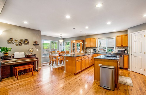 The spacious, two-story interior features upstairs and downstairs living areas, plus a dedicated game room equipped with a library of books and selection of classic card/board games. Musicians in the group can entertain with an acoustic guitar and piano available for guest use. Enjoy fireside conversation in the main floor great room or head upstairs for shows and movies on the Roku TV in the loft living area. For a little bit of friendly competition, there's a Ping-Pong table in the garage.