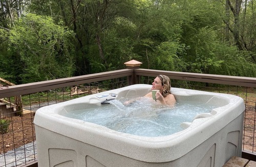 Escape to our fairytale cabin, on 27 secluded, private acres of gorgeous forest on Lake Wedowee. Soak in the hot tub, bake a pizza in the wood-fired oven, snuggle in the porch nest swing or stroll down the river road to swim or kayak. Hike to Wolf Creek and pan for gold. This gorgeous cabin is inspired by the original 1840s rock chimneys-found in the forest—built with reclaimed heart of pine, stained glass & cedar from the woods. Guinea fowl live on site. No kids under the age of 12.