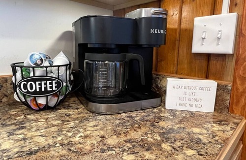 The kitchen is fully equipped with everything necessary to cook a full meal, along with a gas range, refrigerator, microwave, dishwasher, and Keurig coffee station.