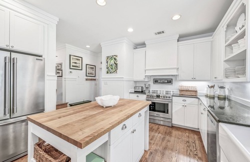 As you enter this 3-story cottage retreat, notice the detailed finishings on the first floor, including 9-foot-tall ceilings and hardwood floors, along with natural colors and textures to compliment the beach vibes. Entertain family and friends in the spacious living room with natural lighting on 2 oversized sofas and 2 linen armchairs. Adjacent to the living area, you’ll find plenty of room for a sit-down dinner with 11 total seats at 2 different tables—and don’t forget the 2 stools at the kitchen island/breakfast bar where you can watch the chef prep dinner. Making dinner was never easier with stainless steel appliances, farmhouse sink, and ample cabinet space. Down the hall is a ground-floor guest bedroom with 1 queen bed with private bath.