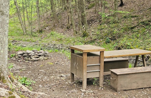 Campsite on a babbling brook in a private catskill mountain setting. Large tent on a deck with a queenside bed. Build a campfire while relaxing by the brook in an Adirondack chair. Tent is equipped with a wood stove for those cool nights. Large picnic table and fire pit.