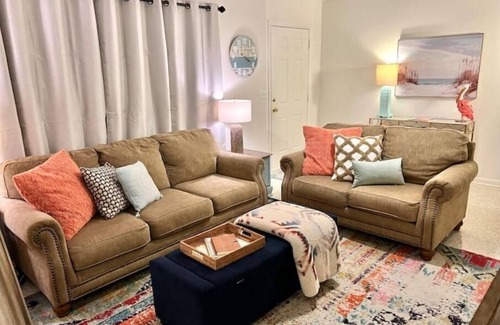 Living room- plush sofa and loveseat with 55inch curved smart tv. High speed internet and blackout curtains for the lazier days.