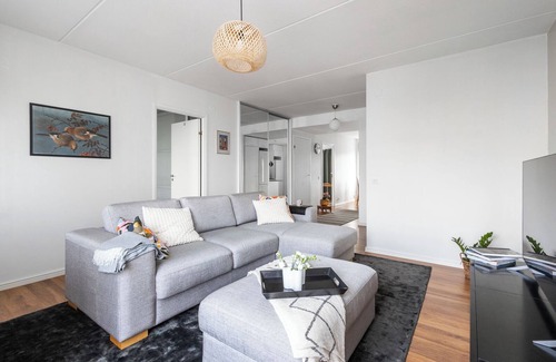 Welcome to this charming 99sqm/1072sqf apartment in Helsinki. This family- and group-friendly property features 3 bedrooms: two with a separable king bed and one with a separable queen. Additionally, there is a cozy living room with a 55” smart TV, a large couch and a crib for a baby. You'll also find fully equipped kitchen that seats 8, a bathroom w/ heated floor, toilette, utility room with washer and dryer and balcony. Located centrally close to sealine, about a mile from the passenger harbor and main railway station. Tidy pets welcome. Parking garage on the next block available at extra charge.