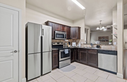Fully stocked kitchen with granite countertops and stainless steel appliances