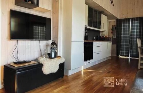 The cabin is 58 m² and offers a cozy atmosphere with a living room, wood-burning fireplace and large windows that fill the space with natural light. The kitchen is fully equipped with a dishwasher, stove, fridge and coffee maker, and the dining table is perfect for family meals.