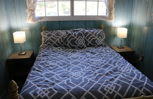 This two bedroom cottage features one large bedroom upstairs with 2 queen size beds. The downstairs has one bedroom with a queen size bed. There is a full size futon in the living room with bedding if needed to be used for sleeping. Renovated in 2017.