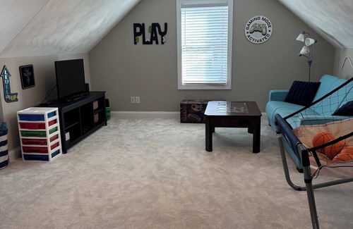 Main floor features living room with large flat screen tv and gas fireplace, and is open to a fully equipped kitchen. Master bedroom is on the main level with on suite. 2 bedrooms/1 bath on top floor with large bonus room that's used as a kids playroom. Lower level has additional 1 bedroom/1 bath and spacious living area equipped with a sleeper sofa, big screen tv, and gym equipment. Back deck features smoker grill and a Blackstone that you are welcome to use. House sleeps 10 comfortably.