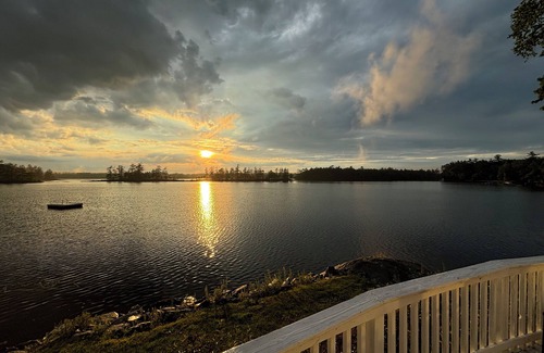 There are two bedrooms and a bath upstairs that are perfect for children. Our family room is spacious with a large flat screen television and access to an expansive deck which offers an incredible view of the lake. Our spacious kitchen, living room and dining room features the original stone fireplace with cathedral ceilings and exposed beams. The antique dining room table overlooking the water seats eight. The kitchen has an island at which an additional six people can be seated. Adjacent to the living room is a second deck with a gas grill and access to a private dock, where you can enjoy the use of a canoe and kayaks.