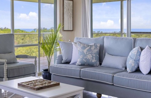 This 6 bedroom, 3 bathroom, multi-storey home, sleeps 10 -12 people and has an expansive 180-degree verandah with spectacular views of the ocean and Solitary Island, reaching out to the eastern sunrise, the northern sun, and southern views down to the Sandy Beach headland and further.