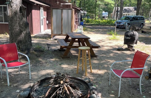 Our 2-bedroom, 1.5-bathroom log cottage is the perfect nature getaway to spend time with loved ones. Located on a double lot (100ft) with plenty of privacy, on-site parking, and nightly EV charging available. You'll find spacious grounds for little ones (or your furry ones!) to run around in the yard. There is a BBQ grill and picnic table where you can enjoy tasty meals. There is also a fire pit, perfect for sitting around and roasting S'mores after a long day spent bathing at the lake. One of our favorite yard features is the 4x8ft outdoor private shower with hot/cold water just 2 steps from the back door! It's great to rinse off from the lake and even better to shower at night under the stars!