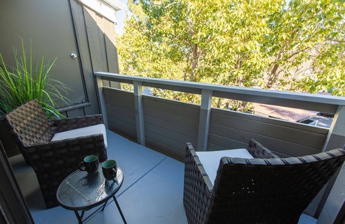 The apartment is just minutes from locally-owned restaurants and cafes, but on days when you want to eat in, this kitchen makes it easy. It's fully equipped with a beautiful blend of custom wood cabinets and sleek granite countertops. Appliances like a microwave, coffee pot, and toaster will help you feel right at home.