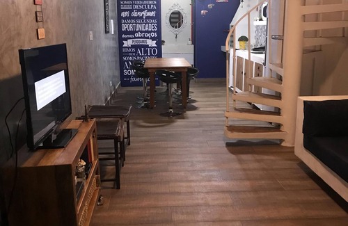 Sobrado with 02 bedrooms, 02 bathrooms, sleeps 4 people in each room, and in ROOM 01 has 01 bed of house and 01 bunk and in ROOM 02 has 01 double bed and 02 mattresses on the floor, living room with SKY TV with open channels and DVD with plenty of movie library, books. Full kitchen with water filter (cold and natural), microwave, electric oven, blender, mixer, refrigerator with frezzer with independent barbecue and everything integrated as a "loft". .