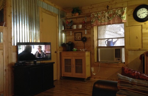 Relaxing outdoor atmosphere with many trees, creek for fishing, hiking. Cabin sits on 17 acres with lots of beautiful trees; sleeps 4-5; kitchenette; bath with shower; loft upstairs bedroom with king size bed. Downstairs futon pops out to a comfortable double bed. A rolloway bed is also available.