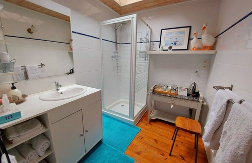*Crossing the Mayenne upon request: contact the reservations department to specify this on the reservation and to ensure availability for your dates. The upstairs suite consists of two bedrooms, each with two 90x200 twin beds, a private bathroom shared by both bedrooms (shower, sink), and a separate toilet. A welcome tray with a kettle and hot drinks is provided.