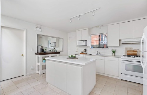 Our 3 bedroom, 1.5 bathroom bungalow is lovely, clean and modern, with amazing natural light from the huge centralized skylight. It's perfect for entertaining with its open-concept dining and living areas, yet still cozy enough for relaxing in front of the gas fireplace. There is a fully equipped kitchen with a dishwasher, gas stove, microwave, Keurig machine and drip coffee maker, island and large dining table. The main bedroom and second bedroom have queen-sized beds, and the third bedroom has a single bunk bed. There are two single mattresses stored under the bottom bunk and one in the closet . The is a large twin sofa bed in the living room. There is one full bathroom and a second half bathroom with toilet and vanity. There are two outdoor entertaining areas, one in the front of the house with a barbeque and full-sized outdoor table, and the other is at the back of the house which affords more privacy.