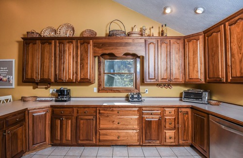 The spacious great room on the main level provides your group with plentiful room to stretch out and relax on the sectional sofa. Watch TV or pop in a DVD as you warm up by the floor-to-ceiling fireplace. A wall of windows lets in lots of natural light and reveals scenic views.